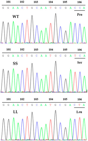 Partial nucleotide sequence results of EPSPS gene for the WT, SS, and LL populations, respectively. A homozygous mutation of Pro106Ser was detected in the SS population and a homozygous mutation of Pro106Leu was identified in the LL population by sequencing chromatograms.