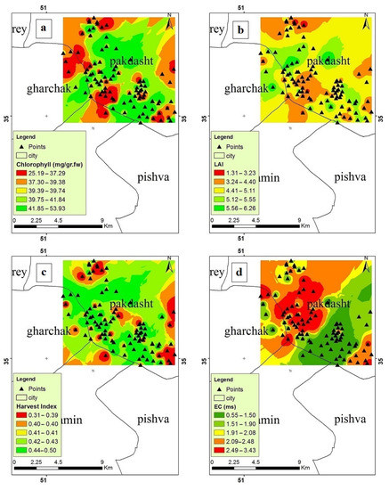 The range of plant and soil variables with a high impact on the wheat yield gap in the fields studied in Varamin Plain of Pakdasht, extracted from the results of the CPA approach. (a) The amount of leaf chlorophyll; (b) LAI; (c) Harvest Index; (d) Soil salinity.