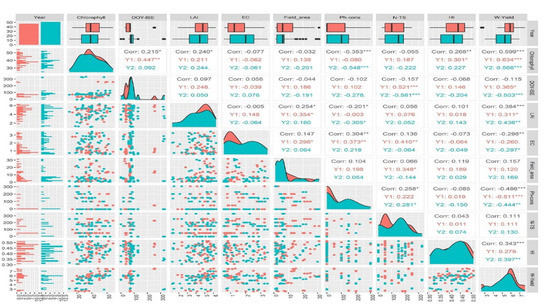 Correlation between eight variables extracted from the CPA approach in total and separately in two years of study. (From left to right, year 1 and 2, the amount of leaf chlorophyll, irrigation at stem extension stage, LAI, soil salinity, field area, phosphorus consumption, nitrogen at the tillering stage, harvest index, wheat yield). Significance level: *** p < 0.001; ** p < 0.01; * p < 0.05.