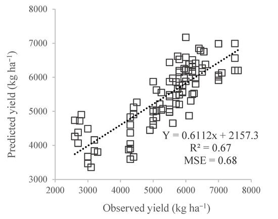 Y (kg ha−1) = 1036 + 75 X1 − 4X2 + 153X3 − 275X4 + 27X5 − 3X6 + 3X7 + 3151X8