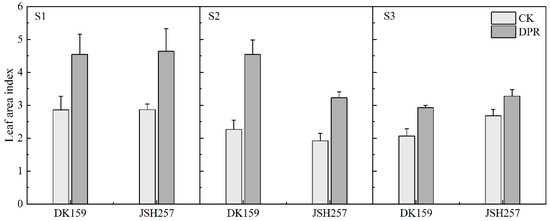As can be seen in Figure 2, the leaf area index following DPR significantly increased by 0.59–2.28 units compared with CK at the three test locations (p < 0.05). The largest increase was observed in S2, with 84.49%, followed by S1, with 60.29%, and S3, with 31.89%.