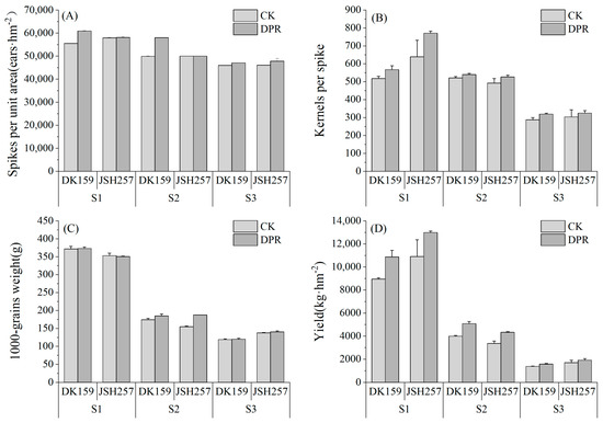 In Figure 3, it can be seen that DPR could increase the number of grains per ear compared with CK by 15.09%, 5.34%, and 55.93% at the three test locations, respectively. The 1000-grain weight following DPR increased by 15.99% compared with CK in S2 (p < 0.05), but it did not increase significantly in S1 or S3. Compared with CK, the yield following DPR significantly increased by 20.30%, 28.07%, and 12.78% at the three test locations. In general, S2 had the largest increase in yield.