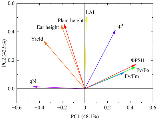 Principal component analysis of chlorophyll and yield. LAI is the leaf area index; Fv/Fo is the photochemical efficiency; Fv/Fm is the maximum photochemical efficiency; qP is the photochemical quenching coefficient; qN is the non-photochemical burst coefficient; ΦPSII is the actual photochemical efficiency.