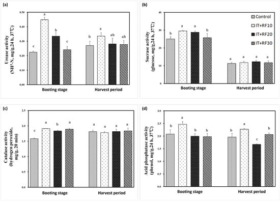 The trend in soil enzyme activities in the four treatments differed with the growth period of the rice (Figure 1). In the booting stage, there was a significant difference in soil urease activity among the four treatments (p < 0.05), and the urease activity of the control and IT + RF 30 treatments were lower than that of IT + RF 10 and IT + RF 20. Compared with the control, the urease activity of the IT + RF 10 and IT + RF 20 treatments increased 49.09% and 35.82%, respectively (p < 0.05). With nitrogen reduction of 10% (IT + RF 10) to 30% (IT + RF 30), the soil urease, acid phosphatase, and sucrase activity significantly decreased (p < 0.05). However, the soil catalase activity of the IT + RF 10 and IT + RF 30 treatments significantly increased compared to the control and IT + RF 20 treatments. During the harvest period, the soil acid phosphatase activity of IT + RF 10 was significantly higher than those observed for the other three treatments (p < 0.05), but there was no significant change in the sucrase and catalase activities. Concurrently, under the treatment of IT + RF10, soil urease activity was higher than the control (p < 0.05).