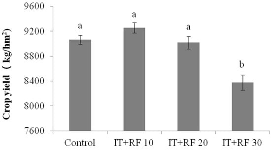 Crop yield of rice under different treatments. IT means integrated technology; RF 10, RF 20, and RF 30 mean 10%, 20%, and 30% reduction of nitrogen fertilizer, respectively. Different lowercase letters indicate a significant difference in the yield among the different treatments (n = 3, p < 0.05).