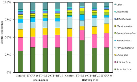 In the booting stage, observed richness (estimated as the observed OTU numbers), abundance (Chao1 and ACE index), diversity indices (Shannon and Simpson) and coverage showed no significant difference between the four treatments (Table 3). However, in the harvest period, the observed richness and diversity index (Shannon) of the IT + RF 10 treatment were lower than the control (p < 0.05). By comparing different growth stages, the results showed that the observed richness and abundance (Chao1 and ACE index) in the booting stage were higher than in harvest period (p < 0.05).
