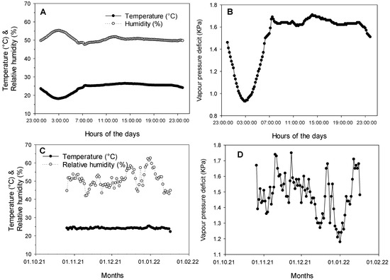 Daily averages of temperature and relative humidity (A), daily average vapor pressure deficit (B), and the temperature and relative humidity (C), and vapor pressure deficit (D) recorded along the experiment.