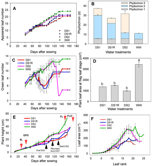 Leaf appearance rate (A), phyllochron (B), green leaves evolution (C), plant leaf area at flag leaf stage (D), plant height growth rate (E), and leaf area per leaf rank (F) compared among different water treatments. 5L: five leaf, GPD: growing point differentiation, FL: flag leaf stage, FLO: flowering. For plant leaf area at flag leaf stage, among water treatments, the mean values with different letters are statistically different (p < 0.05).