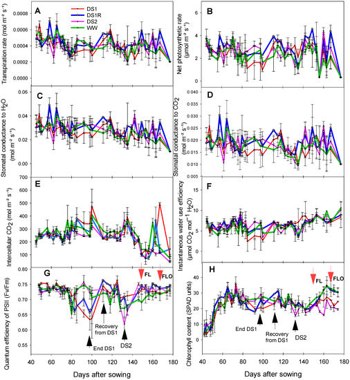 The effect of drought stress on plant morphology varied depending on the phenological stage. Plant height (PH) evolution compared among different water treatments (Figure 4E) revealed a 25% reduction for DS1 compared to well-watered treatment at 76 days after sowing. Once irrigation was resumed, the plants recovered from the first stress and showed a gain in height of 20%. After the induction of the second stress (DS2), a drastic reduction of 35% compared to well-watered (the control) was noticed on plant height at 149 days after sowing.