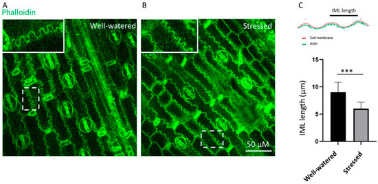 Microscopic images of phalloidin-stained sorghum from well-watered conditions (A) vs. early vegetative drought-stressed conditions (B). Quantification of the length of the IML in well-watered and drought-stressed sorghum (C). Data are means ± SD (n = 30 (10 cells)), *** p < 0.001.