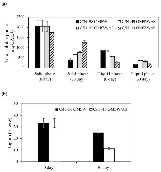 Figure 1a shows the TSP concentrations in the solid and liquid phase of each pretreatment at days 0 and 30. The solid phase experienced a decreasing removal efficiency of TSP as the C/N ratio decreased, showing a TSP reduction of 81, 68, 62, and 27% for 58, 45, 32 and 19 C/N ratio, respectively. The same effect occurred in the liquid phase of the pre-treatments, where removals of 80, 56, 43, and 35% of TSP were recorded for 58, 45, 32 and 19 C/N ratio, respectively. Figure 1b shows the lignin removal of the two best TSP removals in the solid phase (C/N 58 and 45), showing a 25% reduction for the pre-treatment without AS addition (C/N 58) and a 66% reduction for the pre-treatment with AS addition (C/N 45). These results indicate that the addition of AS as a co-substrate to the pre-treatment of OMSW with A. discolor could improve lignin removal, but not phenol reduction. However, the decrease in TSP removal efficiency would be explained by the high concentration of phenols in the medium, a product of lignin depolymerization that can produce phenolic derivatives [36]. Therefore, in future work, we would recommend studying the evolution of the phenols profile during the pre-treatment, in order to understand the effect of lignin degradation on TSP removal.