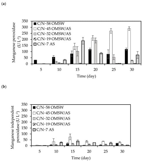 The TS concentration can also impact the time when the MnP achieves maximum. For the TS concentrations of 8 (C/N-7 AS), 32 (C/N-19 OMSW/AS), 69 (C/N-58 OMSW), 75 (C/N-32 OMSW/AS), and 171 g L−1 (C/N-45 OMSW/AS), the MnP activity peak times were 15, 10, 20, 20, 30 days, respectively (Figure 2a). Within this study scope, MnP activity required more time to reach maximum as the TS concentration increased. There is a need to balance the pre-treatment performance and required time in a future study.