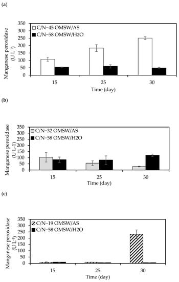 Comparison of manganese peroxidase activity at three control points (15, 25 and 30 days) for the OMSW/AS and OMSW/water mixtures at same concentrations; 171 (a), 75 (b) and 32 g TS L−1 (c).