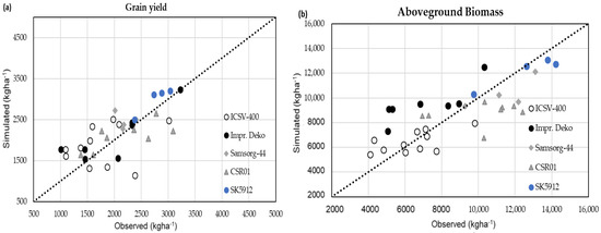 (a) Observed vs. simulated grain yield using experiment conducted in 2016–2018 growing seasons for cultivar ranges from early to late maturing. ICSV-400 (MBE = 103 kgha−1; RMSE = 617 kgha−1, RMSEn = 28.7%); Improved Deko (MBE = 114 kgha−1, RMSE = 370 kgha−1, RMSEn = 18.7%); Samsorg-44 (MBE = 279 kgha−1; RMSE = 377 kgha−1, RMSEn = 17.2%); CSR01 (MBE = −48 kgha−1, RMSE = 301 kgha−1, RMSEn = 13.8%); SK5912 (MBE = 234 kgha−1; RMSE = 254 kgha−1, RMSEn = 9.2%). (b) Observed vs. simulated total biomass using experiment conducted in 2016–2018 growing seasons for cultivar ranges from early to late maturing. ICSV-400 (MBE = 28 kgha−1, RMSE = 1249 kgha−1, RMSEn = 19.5%); Improved Deko (MBE = 2344 kgha−1, RMSE = 2621 kgha−1, RMSEn = 36.8%); Samsorg-44 (MBE = −1100 kgha−1; RMSE = 1432 kgha−1, RMSEn = 12.5%); CSR01 (MBE = −976 kgha−1, RMSE = 1687 kgha−1, RMSEn = 16.5%);SK5912 (MBE = −429 kgha−1; RMSE = 868 kgha−1, RMSEn = 6.9%).