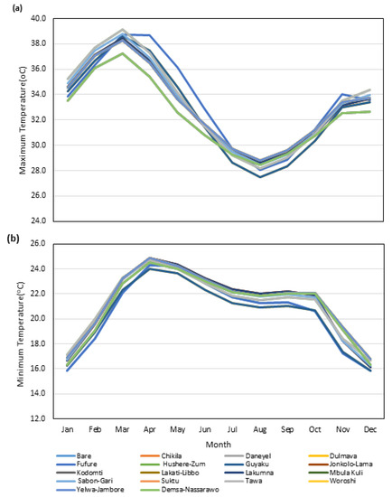 Average monthly variation of (a) maximum temperatures and (b) minimum temperatures between 1985 and 2010 across the simulation sites in Adamawa State. The coefficients of variation (CV) ranged from 3.0 to 3.7% for maximum temperature and 2.0 to 2.3% for minimum temperature.
