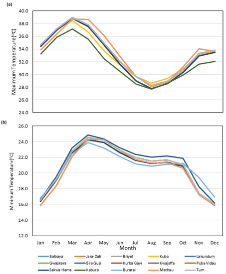 Average monthly variations of (a) maximum temperatures and (b) minimum temperatures between 1985 and 2010 across the simulation sites in Borno State. The coefficients of variation (CV) ranged from 3.0 to 3.7% for maximum temperature and 2.0 to 2.3% for minimum temperature.