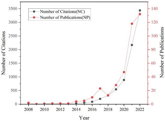 First, an annual tally of all publications was taken (Figure 1). It was first published in 2008. From 2008 to 2013, the corresponding number of papers published and citations increased slowly. Since 2014, both the number of citations (NC) and the number of publications (NP) have shown rapid exponential growth. From 2014 to 2020, it was the first stage of rapid growth in achievements in the field. NC and NP skyrocketed 25.85 times and 10.75 times, respectively. The period from 2020 to 2022 represents the second stage of rapid expansion in outcomes in this field, with NC and NP continuing to soar from a substantial foundation, expanding by 2.88 and 1.81 times, respectively.