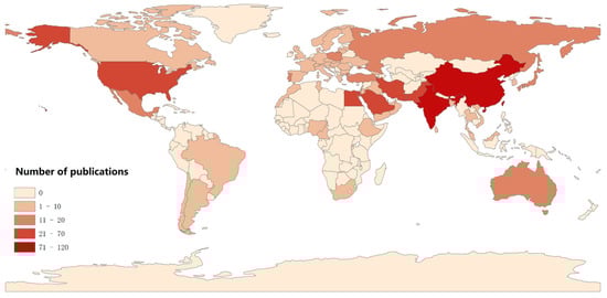 The countries involved in the publication of these papers were counted using HistCite Pro 2.1. A total of 65 countries or regions contributed (Figure 2). It is easy to see that Asia is the region with the greatest concentration and activity of relevant research. Likewise, the top five countries for NP and TGCS are listed (Table 3 and Table 4). China and India have participated in more relevant papers published in the past, contributing 29.4% and 18.4% of all papers, respectively. However, the higher quality of the U.S. papers involved is reflected in the higher TGCS. This may be because the US has a developed economy and can invest more money in this area of research.