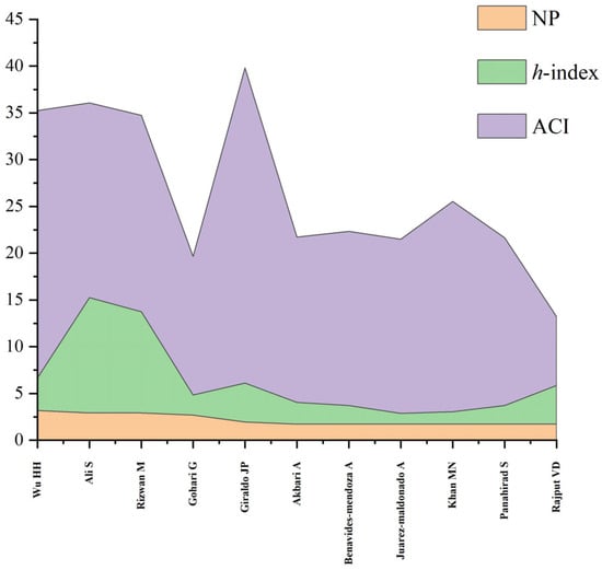 A total of 1848 researchers are involved in this field. Among them, the most productive one is Wu HH from Huazhong Agricultural University. He is involved in a total of 13 outstanding publications from 2017 to 2022. He was followed by Ali S from Government College University and Rizwan M from Qatar University, both of whom were involved in the completion of 12 publications. The analytical hierarchy process (AHP), a crucial multiple-criteria decision-making method, has been extensively investigated and used in the past due to its broad applicability and simplicity [33,34]. Han et al. (2004) used AHP stratified analysis to synthesize the influence of researchers, and indicated that the weights of NP, h-index, and ACI (the average number of citations per paper by the researcher) were 24.39%, 16.64%, and 58.97%, respectively [35]. Consequently, we calculated the final scores of researchers with larger outputs (NP ≥ 7) according to this weighting factor (Figure 3). The results showed that Giraldo JP from the University of California scored 39.80 and ranked first, followed by Ali S (36.08), Wu HH (35.24), and Rizwan M (34.73).
