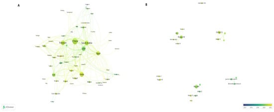 VOSviewer is excellent visualization software for bibliometric analysis and can be used to draw collaborative network diagrams of authors and countries and co-occurrence network diagrams of keywords [32]. We used VOSviewer 1.6.18 to display collaborative network diagrams of authors and countries as well as co-occurrence network diagrams of keywords across all literature.