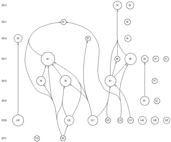 The literature with high TLCS first appeared in 2014, which is consistent with the above-mentioned that this field has gradually attracted wide attention since 2014. Literature with high TLCS was published from 2014 to 2020, while literature published from 2020 to 2022 had a decline in peer recognition. The literature with a high TLCS value was No. 61, 49, 70, 65, 142, 112, and 131 (The serial number here refers to the serial number of the document in the local database). In general, references 61, 70, 65, and 112 (The serial number here refers to the serial number of the document in the local database)serve as key bridges connecting the interconnections and citations in this field.