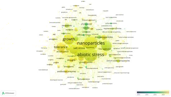 Keyword co-occurrence uses keywords from the literature to construct a semantic map of the domain, enabling scientific discovery of connections between sub-domains and facilitating researchers to track trends [41]. Figure 6 shows the keyword co-occurrence mapping generated using VOSviewer. Older keywords are shown in purple, while newer keywords are shown in yellow. As can be seen, the most notable keywords are nanoparticles, abiotic stress, growth, tolerance, and salt stress. This suggests that the selected literature is primarily concerned with NPs improving plant tolerance to abiotic stresses and, as a result, plant growth in abiotic stress environments. The value of NPs in mitigating salt stress has been studied the most in the past. Early important keywords were mainly: “phytotoxicity”, “toxicity”, “Arabidopsis thaliana”, etc. The bulk of research on the effects of NPs on plant abiotic stress resistance began, like many studies, with the study of A. thaliana, the model plant [42,43,44,45]. Later, the keywords became antioxidant enzymes, responses, and proline. This suggests that studies targeting the mitigation of abiotic stresses in plants by NPs at that time were focused on physiological aspects such as antioxidant enzymes and osmoregulation. Currently, the most important keywords, apart from the largest ones mentioned earlier, are ZnO nanoparticles, drought stress, cerium oxide nanoparticles, foliar application, Triticum aestivum L., and soil. ZnO NPs are currently one of the most popular NPs, with global production expanding from 550 to 33,400 metric tons in a short period and still rising [46]. Many studies have now shown that ZnO NPs can effectively enhance plant resistance to abiotic stresses. According to our previous research, ZnO NPs can enhance antioxidant systems and photosynthesis in tomato (Lycopersicon esculentum) and rice (Oryza sativa) seedlings, enhance the activity of antioxidant enzymes, plant hormone crosstalk, and late embryogenesis-abundant protein in developing seeds of Styrax tonkinensis to alleviate abiotic stress [11,47,48,49,50]. The change in keywords indicates that research on NP mitigation of abiotic stresses is gradually developing in-depth, and not only is the variety of NPs increasing, but so are the application methods, with a broad scope of application in both agriculture and forestry.