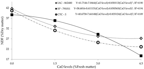 There was an interaction effect between the genotypes and CaO levels on NDFa content (Table 2). The visualization of these interactions between the genotypes and CaO levels showed that NDFa levels (Figure 1) were similar in terms of quadratic effects for the IAC-862480 and CTC-3 genotypes, with minimum points at 4.1% and 4.6% CaO, respectively. For the SP-791011 genotype, the maximum point was observed at 1.0% CaO. At 3.0% CaO, the SP-791011 genotype was superior to IAC-862480 and CTC-3 (p < 0.05) (Table 4). With the addition of 4.5% CaO, the IAC-862480 genotype was superior to the others, followed by the CTC-3 and then SP-791011 genotypes (p < 0.05).