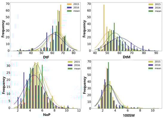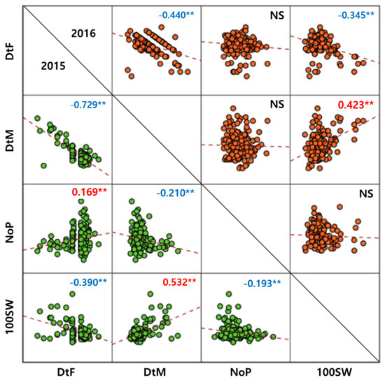 The correlation coefficients between the agronomic traits in each environment are presented in Figure 2. In 2015 and 2016, DtF and DtM exhibited a negative correlation (r = −0.729 ** and −0.440 **, respectively). DtF and the 100SW also showed a negative correlation (r = −0.390 ** and −0.345 **, respectively). On the other hand, DtM and the 100SW had a positive correlation (r = 0.532 ** and 0.423 **, respectively). DtF and the NoP, DtM and the NoP, and the 100SW and the NoP had a significant correlation in 2015 but not in 2016.