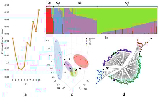 (a) Cross-validation error for the assumed number of populations (K) in ADMIXTURE analysis. (b) Classification of 203 wild soybean accessions into four sub-populations using ADMIXTURE. The colors red, blue, purple, and green represent separate groups with different levels of admixture. (c) Scatter diagram for the principal component analysis of 203 accessions calculated using PLINK, with each colored spot representative of one cluster of Q1 to Q4. (d) Neighbor-joining cluster analysis in MEGA11, with each colored spot representative of one cluster of Q1 to Q4.