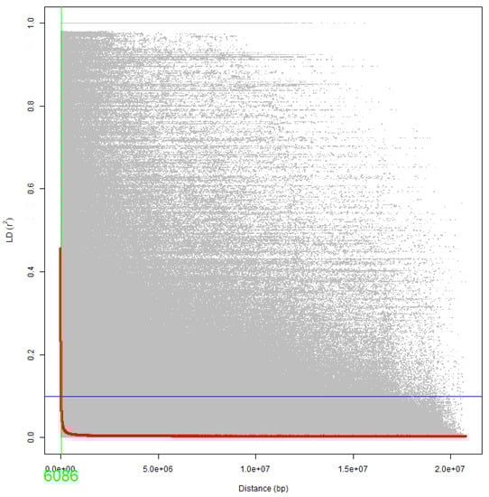 LD estimation was conducted using TASSEL with an LD sliding window of 500 within individual chromosomes [45]. The identification of candidate genes was carried out in the region considering the LD for the SNP detected as a result of the GWAS and in the downstream and upstream regions. Glyma.Wm82.a2.v1, a soybean reference genome from www.soybase.org (accessed on 1 November 2022), was used as the gene model for candidate gene identification.
