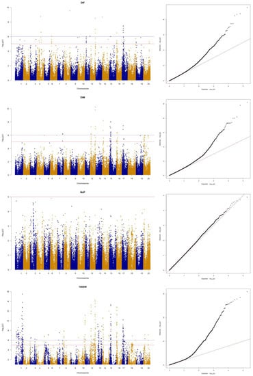 In this study, association analysis was performed with a linear mixed model for the four major agronomic traits. According to the results of the Manhattan and QQ plots presented in Figure 5, 18 SNPs across 9 chromosomes for DtF, 32 SNPs across 7 chromosomes for DtM, and 41 SNPs across 16 chromosomes for the 100SW were detected at the significance threshold level (−log10(p) = 6.29). However, no suggestive or significant SNPs were detected for the NoP.