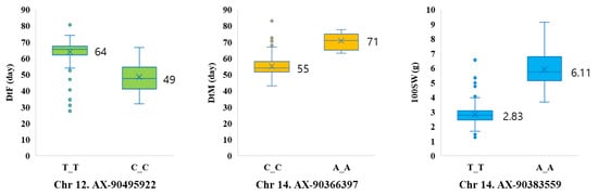 Interestingly, the AX-90495922 SNP marker on chromosome 12 was consistently associated with both DtF and DtM, while AX-90472604 on chromosome 15 was significantly associated with DtM and the 100SW. For each trait, the allelic effect of the SNP marker with the lowest p value was estimated. The DtF-associated SNP marker AX-90495922 on chromosome 12 had the alleles T/C, and the average DtF for the individuals with TT alleles was 64 d, 15 d longer than the average DtF for the individuals with CC alleles (49 d). The DtM-associated SNP marker AX-90366397 on chromosome 14 had the alleles C/A, and the average DtM for the individuals with CC alleles was 55 d, which was 16 d shorter than the average DtM for the individuals with AA alleles (71 d). The 100SW-associated SNP marker AX-90383559 on chromosome 14 had the alleles T/A, and the average 100SW for the individuals with TT alleles was 2.83 g, which was 3.28 g lighter than the average 100SW for individuals with AA alleles (6.11 g) (Figure 6).