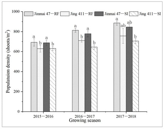 Population density (shoots/m2) of the genotypes Jinmai 47 and Jing 411 under the rain-fed (RF) and supplemental irrigation (SI) conditions. For each growing season, the columns with the different letters differ significantly according to the least significant difference (LSD) test (p < 0.05). Vertical bars indicate the standard deviation.