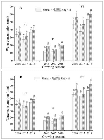 With the SI, PT and E, the sum ET increased more in Jing 411 than in Jinmai 47 (Figure 2A,B). For each genotype, the ET was rather higher under the SI than under the RF condition, and the PT increased by a larger amount than the E, indicating the primary effect of the soil water availability on the water consumption of the crop population in the field, particularly on its transpiration (Figure 2A,B). Among the three growing seasons for each genotype, though the E varied slightly regardless of the water conditions, both the PT and ET were rather larger in 2018 than in the other two years under the RF condition, which could be due to the much higher precipitation that occurred in April (Figure 2A and Table 1).