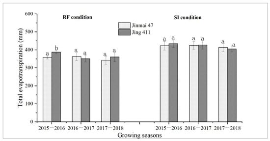 Total evapotranspiration (TET) over the whole growing season for the genotypes Jinmai 47 and Jing 411 under rain-fed (RF) and supplemental irrigation (SI) conditions. For each growing season, different letters indicate significant differences between the two genotypes at p < 0.05 based on the LSD test. Vertical bars indicate the standard deviation.