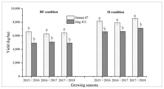 Grain yield of the genotypes Jinmai 47 and Jing 411 under rain-fed (RF) and supplemental irrigation (SI) conditions. For each growing season, different letters indicate significant differences between the two genotypes at p < 0.05 based on the LSD test. Vertical bars indicate the standard deviation.