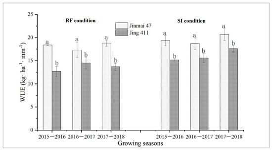 Water use efficiency (WUE) of the genotypes Jinmai 47 and Jing 411 under rain-fed (RF) and supplemental irrigation (SI) conditions. For each growing season, different letters indicate significant differences between the two genotypes at p < 0.05 based on the LSD test. Vertical bars indicate the standard deviation.