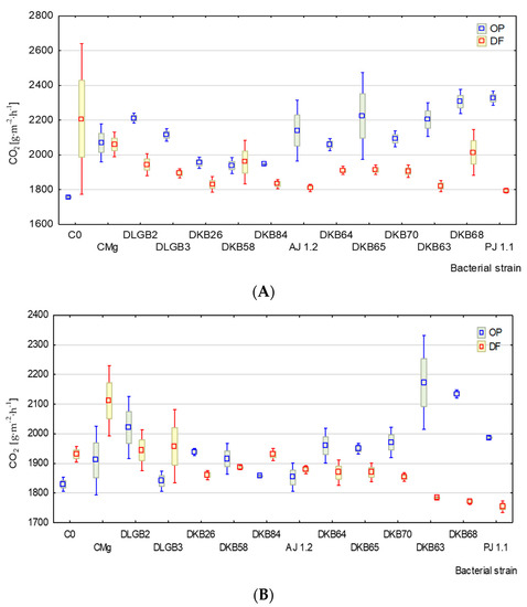 The average level of CO2 emission from the peat substrate including a plant under optimal moisture levels was 2096 g·m−2·h−1, while under water deficit it was 1921 g·m−2·h−1. The coefficients of variation (CV) were 9% and 10% (Table 1).The lowest CO2 emission level under drought stress (variant DF) was recorded after inoculation with Azotobacter sp. strain AJ 1.2 (1778 g·m−2·h−1) (Figure 2A). Under optimal moisture conditions (OP variant), the lowest CO2 emission level was recorded in the variant C0 (1747 g·m−2·h−1). The maximum values of CO2 emissions under water deficit were recorded in the control variant (2898 g·m−2·h−1) and after inoculation with Pantoea sp. strain DKB 65 (2619 g·m−2·h−1).