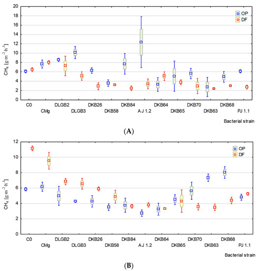 Emission of CH4 from peat substrate with (A) and without (B) strawberry plant: OP—optimal moisture; DF—water deficit; C0—control plants, which were not inoculated with rhizosphere bacteria; CMg—soil application of a 10 mM KMgSO4 solution without bacteria in the amount of 40 cm3/plant.