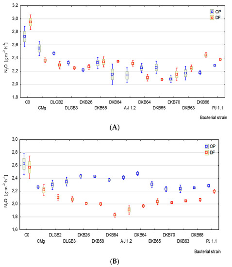 The average N2O emission level from the peat substrate without a plant under optimal moisture and water deficit was, respectively, 2.35 and 2.07 mg·m−2·h−1. The coefficients of variation (CV) were 5% and 9% (Table 1). In the DF variant, the lowest emission of this gas was from the substrate after inoculation with Bacillus sp. strain DKB 84 (1.78 mg·m−2·h−1), whereas in the OP variant after inoculation with Pantoea sp. strain DKB 63 (2.14 mg·m−2·h−1) (Figure 4B). The maximum N2O emission values of 2.83 mg·m−2·h−1 (DF) and 2.85 mg·m−2·h−1 (OP) were found in the control variant.