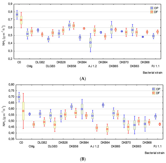 The average level of NH3 emission from the peat substrate with a plant in the OP variant was 0.54 mg·m−2·h−1, whereas in the DF variant it was 0.56 mg·m−2·h−1. The coefficients of variation (CV) reached 20% and 13% (Table 1). Under the conditions of water deficit in the substrate, the lowest emission of NH3 was recorded after inoculation with Pantoea sp. strain DKB 64 (0.43 mg·m−2·h−1), whereas in the OP variant it was recorded after inoculation with Azotobacter sp. strain AJ 1.2 (0.24 mg·m−2·h−1) (Figure 5A). The highest emission of this gas was recorded in variant C0—0.85 mg·m−2·h−1 (DF) and 0.85 mg·m−2·h−1 (OP).