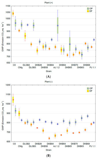 The average GWP from the peat substrate with a plant under optimal substrate moisture conditions was 1131 emission CO2 − eq·ha−1, and under water deficit it was 1073 emission CO2 − eq·ha−1. The coefficients of variation (CV) were 28% and 24% (Table 1). The highest GWP was recorded in variant C0 and after inoculation with Azotobacter sp. strain AJ 1.2 (OP) and Bacillus sp. strain DLGB2 (DF) (Figure 6A). Only under optimal conditions did Bacillus sp. strain DLGB3 and Bacillus sp. strain DLGB2 not cause a statistically significant increase in GWP.