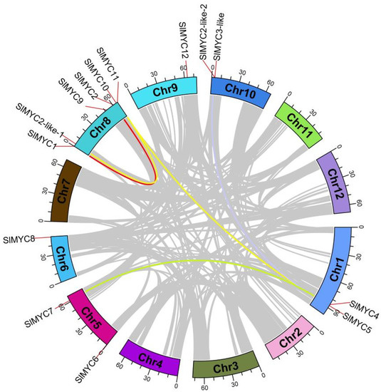 Genome distribution and synteny relationship of SlMYC genes in Solanum lycopersicum. Different chromosomes were used different colors. Colored lines represent the syntenic pairs of SlMYC.