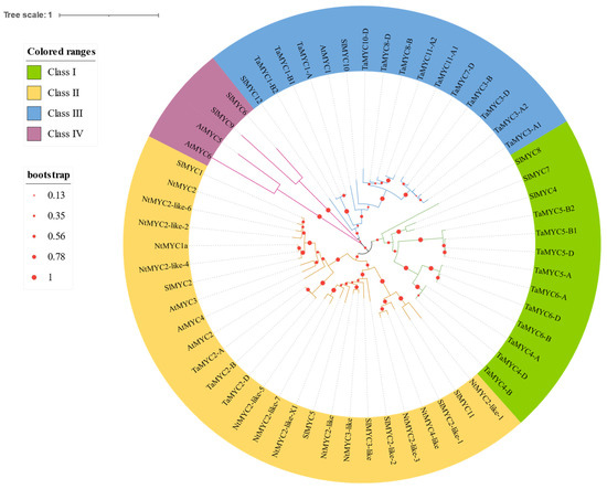 - Bai, J.F.; Wang, Y.K.; Guo, L.P.; Guo, X.M.; Guo, H.Y.; Yuan, S.H.; Duan, W.J.; Liu, Z.; Zhao, C.P.; Zhang, F.T.; et al. Genomic identification and characterization of MYC family genes in wheat (Triticum aestivum L.). BMC Genom. 2019, 20, 1032. [Google Scholar] [CrossRef] [PubMed]