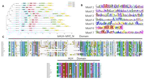 The top seven potential conserved motifs in SlMYCs from diverse classes were identified using the MEME software. SlMYC proteins belonging to the same class shared similar motifs. Class I (SlMYC1, SlMYC2, SlMYC2-like-1, SlMYC2-like-2, SlMYC3-like, SlMYC5, and SlMYC11) exhibited five to seven motifs. Class II (SlMYC4, SlMYC7, and SlMYC8) exhibited six to seven motifs. Class III (SlMYC10 and SlMYC12) had five motifs. In comparison, Class IV (SlMYC6 and SlMYC9) had the lowest number of motifs with three to four motifs, indicating that proteins on the same branches might have substantially similar functions (Figure 3A). Motifs three, four, five, and seven corresponded to the bHLH-MYC_N domains. In contrast, motif one corresponded to the bHLH domain (Figure 3A,B). The bHLH_MYC_N and bHLH domains are located at the N- and C-termini of the MYC family, respectively (Figure 3C). An extremely conserved bHLH domain was predicted for all 14 SlMYC proteins. The highly conserved bHLH domain, which is associated with DNA binding, consists of approximately 50 amino acids.