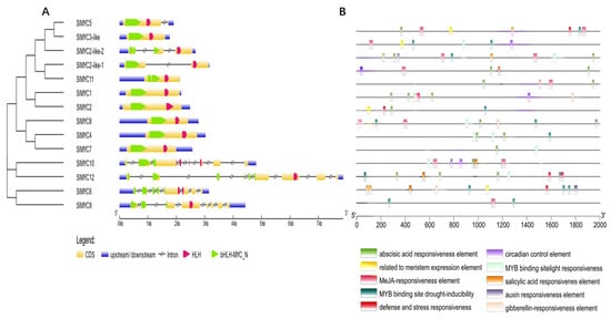 Analysis of exon–intron structures and cis-regulatory elements of SlMYC genes. (A) Exon–intron organization of MYC genes in Solanum lycopersicum (Sl) grouped according to their gene orthology. Blue and yellow bars indicate untranslated (UTR) regions and exons. Black interrupted lines indicate introns. The tree is rooted. (B) The number and composition of cis-acting regulatory elements in the promotor region of SlMYC genes. The 2000 base pair promoter region of each gene copy is displayed. Different colorful shapes show different elements.