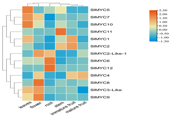 Response analysis of SlMYC genes in the roots, stems, leaves, flowers, immature fruit, and mature fruit by qRT−PCR. RNA samples were extracted from different tissues of tomato.