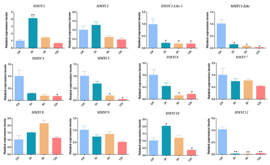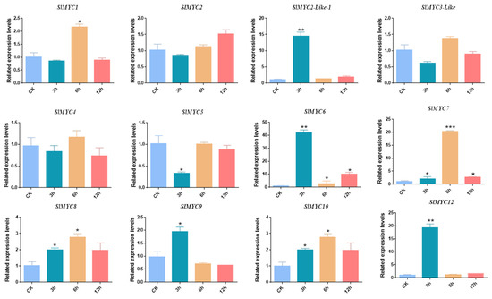 Response analysis of SlMYC genes in tomato leaves under NaCl stress by qRT-PCR. The expression patterns of SlMYC in response to 150 mM NaCl treatment for 3 h, 6 h, and 12 h. Data represent the means of three biological replicates ±SD. Different colors were used to indicate different treatment times (p-values less than 0.05 are summarized with one asterisk, and p-values less than 0.01 are summarized with two asterisks).