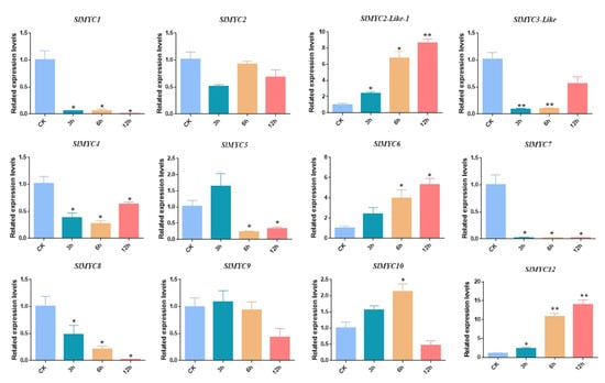 Finally, the expression of SlMYC genes under 100 mM mannitol treatment was examined. At 3 h, 6 h, and 12 h following mannitol treatment, the expression levels of SlMYC1, SlMYC3-like, SlMYC4, SlMYC7, and SlMYC8 were lower. SlMYC2-like-1, SlMYC6, and SlMYC12 exhibited a similar expression pattern, and their expression gradually increased over the treatment period and peaked at 12 h. The expression of SlMYC5 was significantly downregulated by 78.5% and 68.4% 3 and 6 h after mannitol treatment, respectively. Following 6 h of mannitol treatment, the expression of SlMYC10 was 2.1-fold higher than in the control. The expression of SlMYC2 and SlMYC9 did not differ substantially from the control group following mannitol treatment (Figure 8).