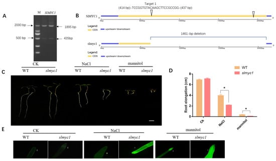 CRISPR/Cas9-mediated mutation of the SlMYC gene and the response of slmyc1 to NaCl and mannitol stress. (A) The size of DNA fragments amplified by PCR with genomic DNA. M: DNA marker. (B) Schematic diagram of the sgRNA target sites on the SlMYC1 gene and the sequencing results of the sequence near the mutation site of the SlMYC1 gene. M: marker. (C) Growth of the slmyc1 mutant and wild-type (WT) seeds after 96 h of NaCl and mannitol treatment. The tomato nutrient solution treatment was employed as a control (CK). (D) Statistical analysis of the root length of the slmyc1 mutant and the WT at 96 h after NaCl and mannitol treatment (p-values less than 0.05 are summarized with one asterisk). (E) Determination of ROS content in root tips of the slmyc1 mutant after 96 h of NaCl and mannitol treatment.